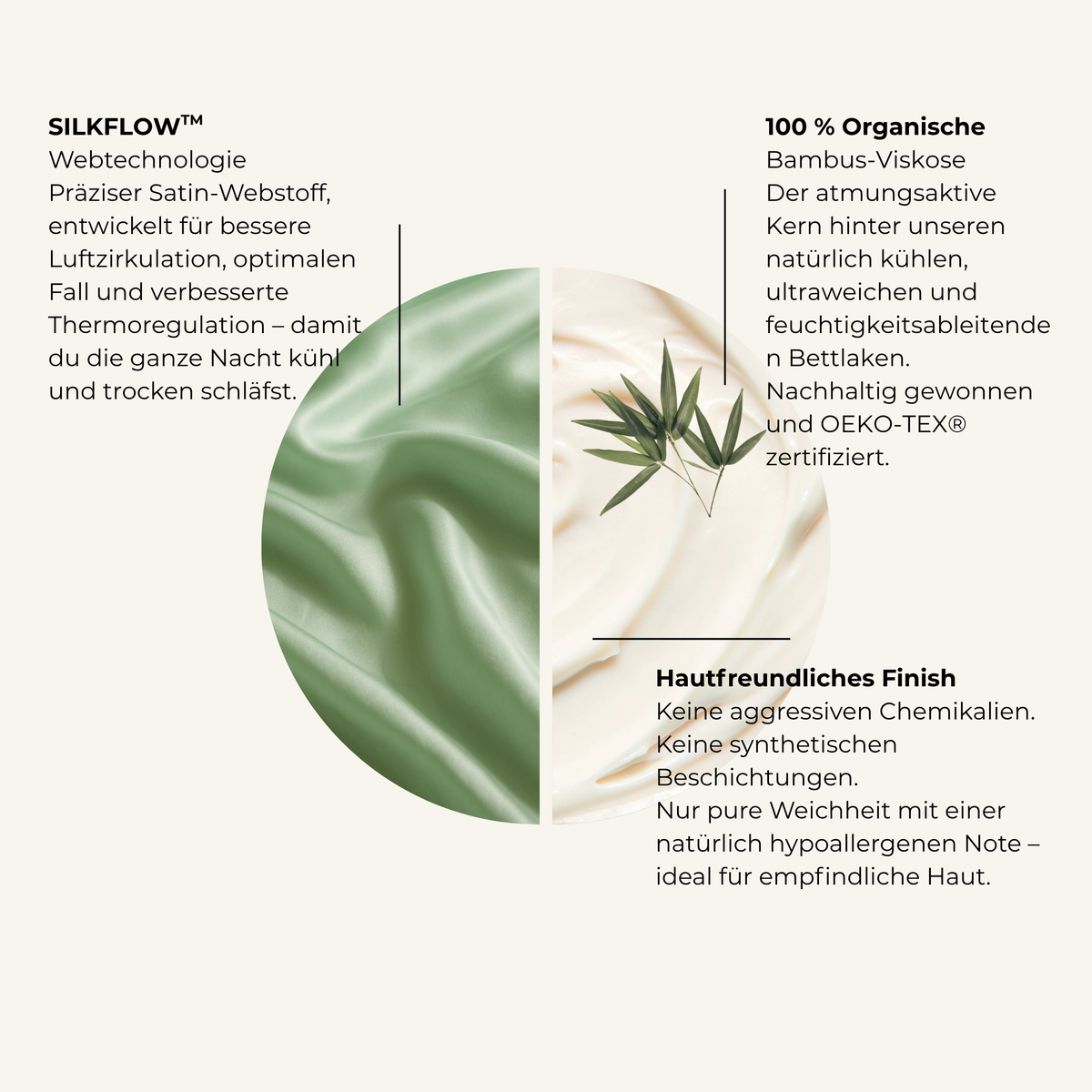 Unsere Bettwäsche aus 100 % Purem Bambus wurde entwickelt, um Dir frischere, weichere und gesündere Nächte zu schenken. Dank der SILKFLOW™-Webtechnologie sorgt unser Stoff für bessere Luftzirkulation, eleganten Fall und natürliche Temperaturregulierung – damit du dich in jeder Jahreszeit wohlfühlst.