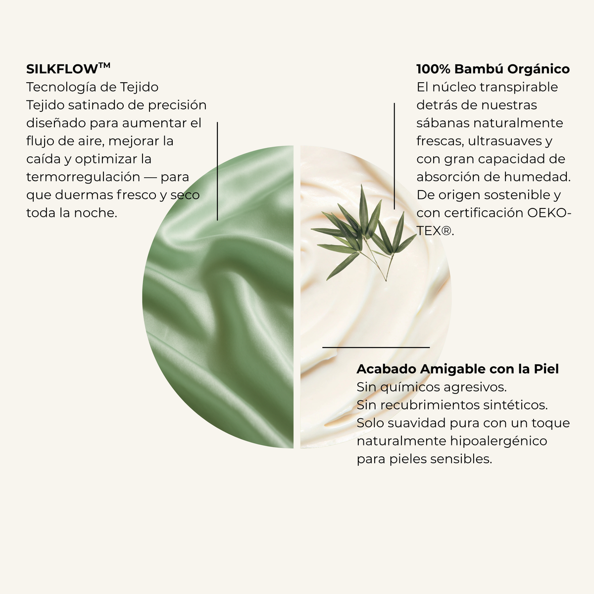 Nuestra línea de ropa de cama 100% puro bambú fue diseñada para ofrecerte noches de sueño más frescas, suaves y saludables. Gracias a la tecnología de tejido SILKFLOW™, nuestros tejidos garantizan una mayor circulación de aire, caída elegante y regulación térmica natural — para dormir cómodo en cualquier estación.